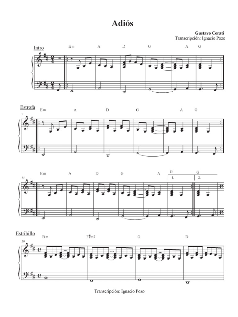 Cambiar Cifrado Americano Latino Cambiar Tonalidad -1- ½ ½ 1. Adios Acordes por Gustavo Cerati. Mim La Re Sol La Sol No te confundas no sirve el rencor Mim La Re Sol La Sol son espasmos despues del adios.