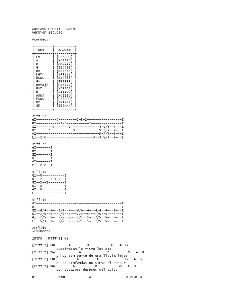Gustavo cerati acordes adios. Letras tablaturas y acordes de Gustavo Cerati chords lyrics A Merced acordes. Adios - Gustavo Cerati - Cifra Club. Suscribite para más videos.